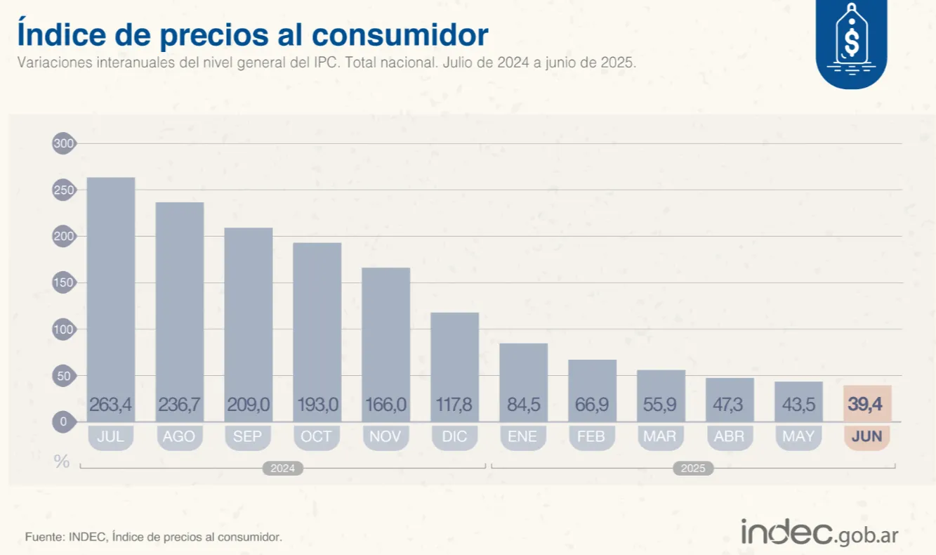 9-INDEC – Inflación mes de Junio 2025. La inflación del mes de junio de 2025 fue de 1.6%, generando una inflación interanual del 39.4%. El dato de inflación fue levemente superior al registrado en el mes de mayo de 2025, el cual había sido el número más bajo en los últimos 5 años. En lo que va del año, es decir, en el primer semestre del año,lleva acumulado un 15.1%.